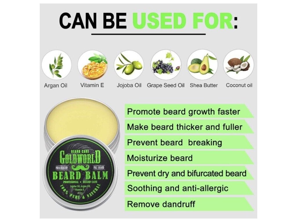 Set obsahuje: pěnu na vousy, olej na vousy, balzám na vousy, kartáč, hřebínek, nůžky.